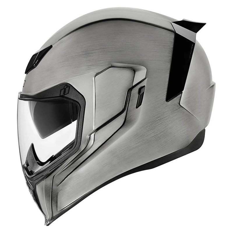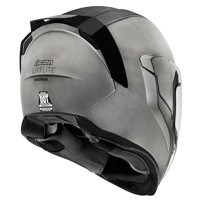 Too fast for love. The Airflite now joins the ranks in our Quicksilver ICON Helmet series. This unique finish is accomplished by applying silver paint to the shell, then painstakingly antiquing each helmet by hand. No two are alike. This process is what gives each one its depth and sheen. Wear it and be shiny.