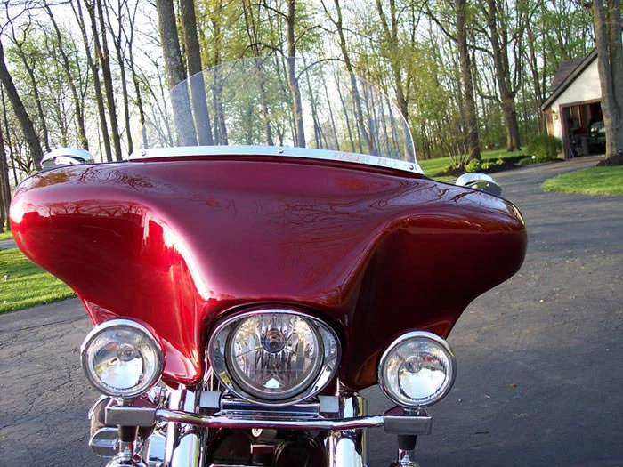 The front of the batwing fairing is offered in two designs, the traditional smooth front look, or the simulated vent front look. Neither style will alter the performance of the fairing as they are only cosmetic additions. The smooth front look gives the appearance of a more classic fairing, while the simulated vent gives a more contemporary style seen less frequently. Please note that the vented front look is only cosmetic and does not provide a functioning air vent.