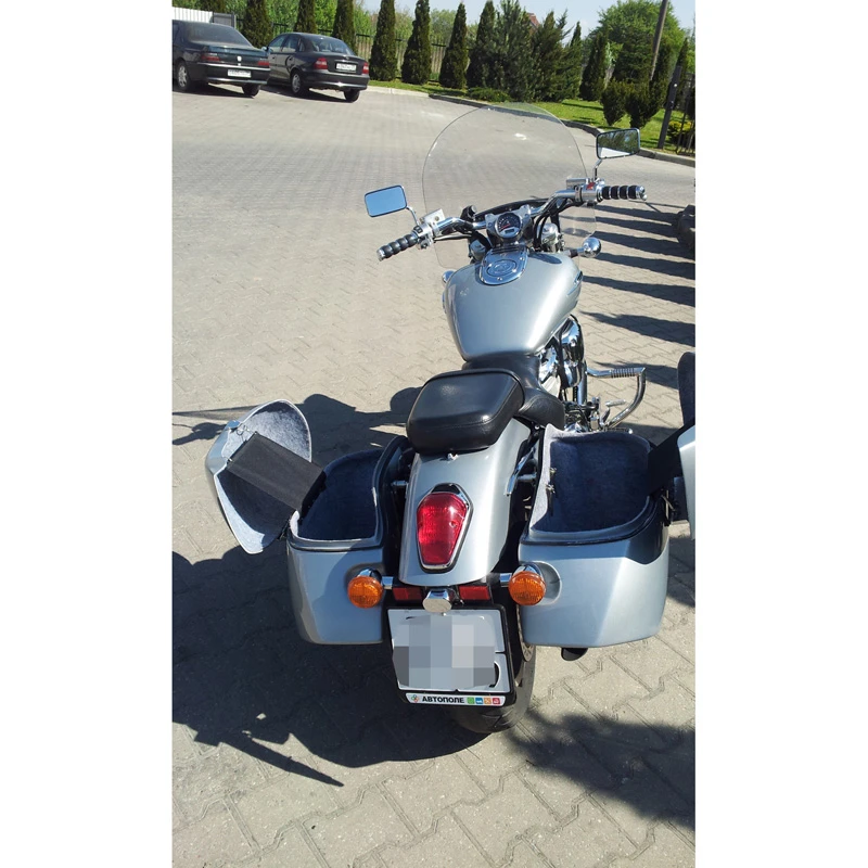 These Saddlebags are made of high quality hand-laid fiberglass which is much stronger than chop-gun fiberglass. They are mounted with new designed quick release brackets, you don’t need to relocate the stock rear turn signals, you can easily remove them in 10 seconds. 40 Liters of Storage Capacity for each side of Hardbags for VTX C. The inside is carpet lined which protect your valuable stuff from scratching and bouncing inside the hard saddlebags. The hardbags come with TKY side lockable latches, they are unique feature in the market and allows fitting with TKY’s Tour Packs with audio system.